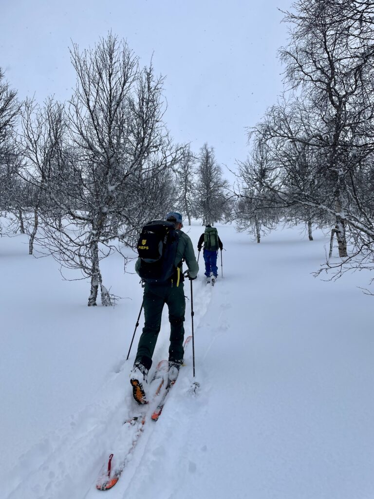 Dag 1 går vi igenom utrustningen du behöver och hur den fungerar både i teori och praktik. Vi genomför en enkel topptur tillsammans i skidbackarnas närhet och planerar därefter morgondagens tur utifrån snöförhållanden, väder och gruppens förutsättningar.